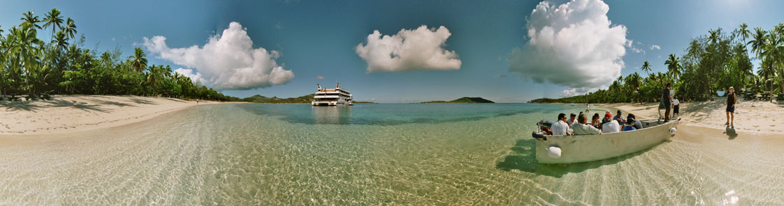 Blue Lagoon Beach File size 86 kB. Choose JPEG or Java Viewer. Spending a day at the cruise company's major asset, the Nanuya Lailai island with the famous Blue Lagoon beach, was the undisputed highlight of the cruise. The pano shows our landing in the morning with the ship's dinghies. The beach was still virgin at this time (it must have been groomed) and exclusively our own for the whole day. The sunny wheather of that day eventually accounted for something like 90% of our total travel tan.