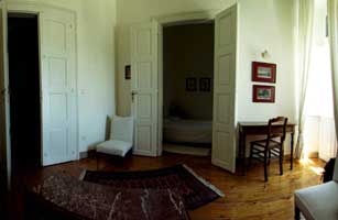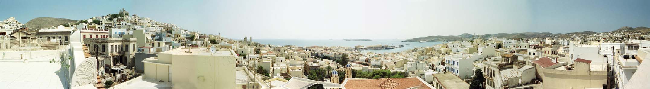 View from our terrace at Hotel Omiros, Ermoupolis Image size JPEG file 54 kB. A well-restored classicistic town house from the last century, the Hotel Omiros is loaded with charm (see the room from inside). This pano is one of those I-sit-here-and-make-a-pano-panos which give you a headache when you try to assemble them.