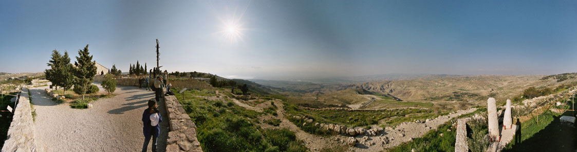 Mount Nebo File size 76 kB. Choose JPEG or Java Viewer. Enjoy the view Moses might have enjoyed thousands of years ago. Today we are looking into the lush greenery of Israeli-occupied West Bank, with a glimpse on the Dead Sea's edge. The Moses Memorial Church in the backdrop is well worth visiting, like the rest of neighboring Madaba.